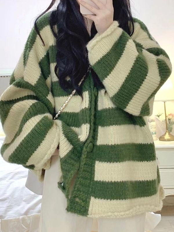 Contrast Color Striped V Neck Rolled Loose Knit Cardigan