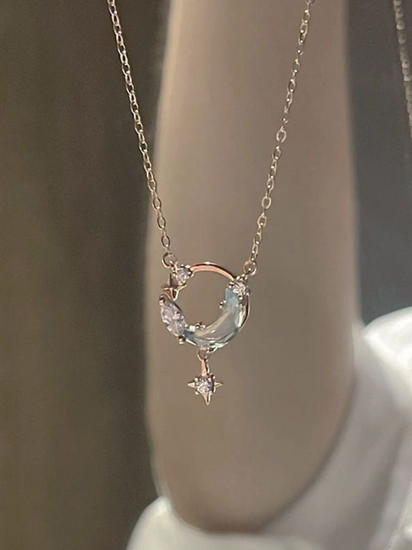 Silver Hollow Out Star Moon Charm Necklace