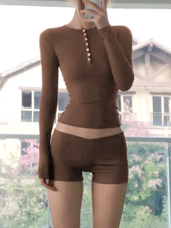 Solid Breasted Long Sleeve Tee&Low Rise Shorts Set