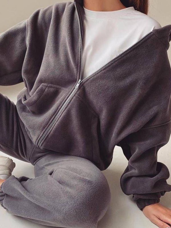 Solid Zip Up Oversized Hoodie&Bound Feet Sweatpants Set