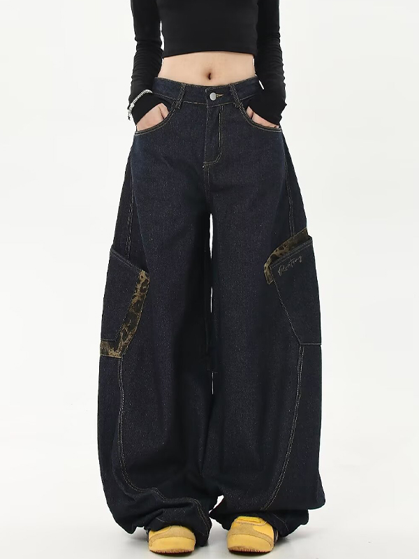 American Retro Leopard Print Stitching Boyfriend Jeans