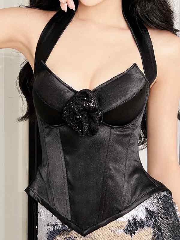 Three-dimensional Flower Decor V Neck Halter Corset Top