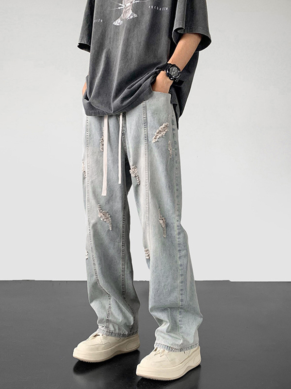Men’s Wash Ripped Drawstring Straight Leg Pants