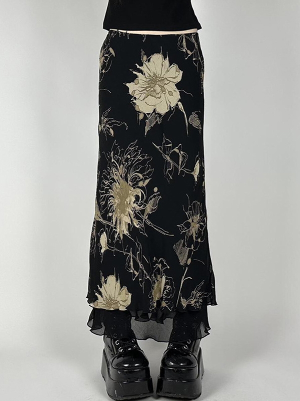 European And American Style Retro Tie-Dye Floral Print Mesh Maxi Skirts