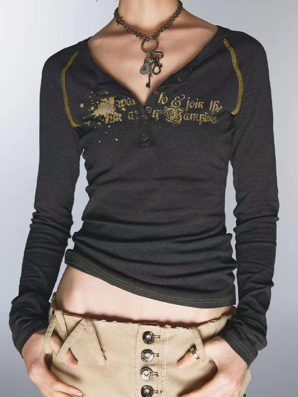 Vintage Print V Neck Breasted Long Sleeve Tee